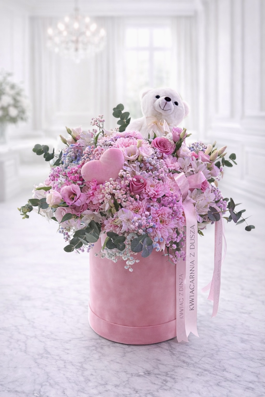 Delikatny flowerbox w jasnej, różowej kolorystyce, uzupełniony miękkim misiem. Idealny wybór na narodziny dziecka, baby shower albo jako wyjątkowy prezent z okazji ważnego, emocjonalnego momentu.